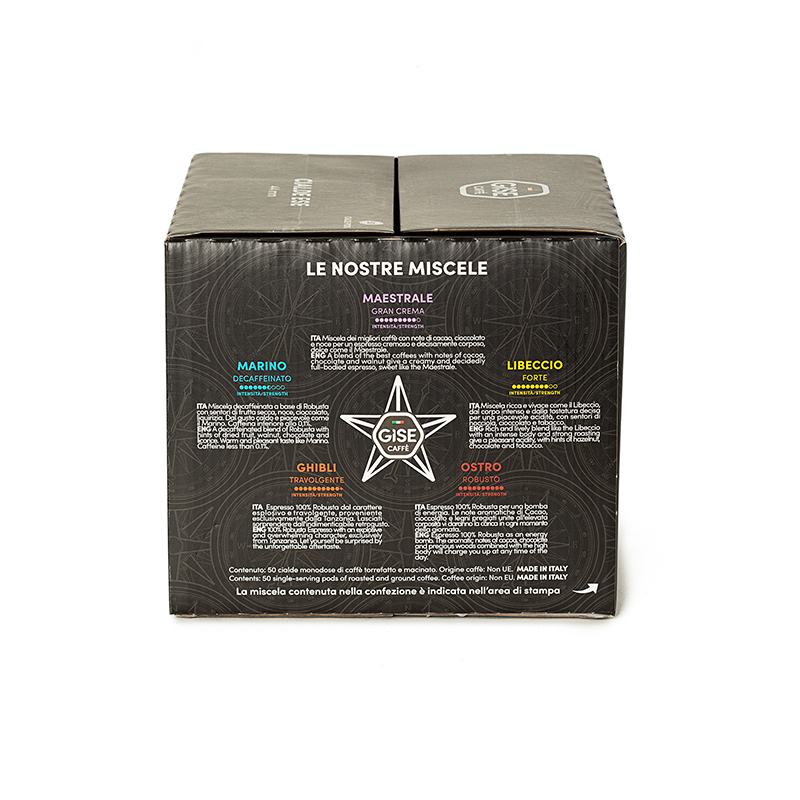 Contenuto: 50 cialde monodose di caffè torrefatto e macinato. Origine caffè: Non UE. MADE IN ITALY